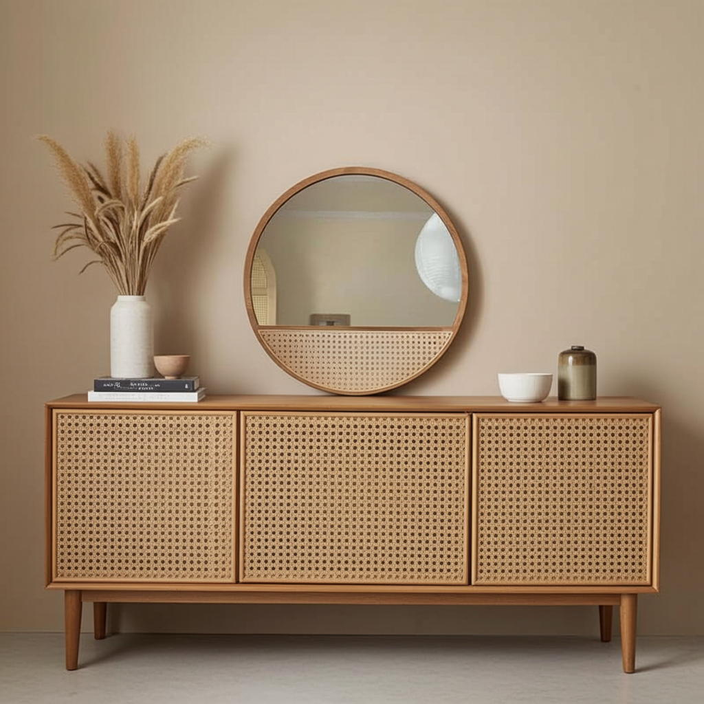 This wooden frame with mirror effortlessly combines solid wood and rattan to create a stunning piece that complements any interior style. It's round shape and intricate rattan frame lend a bohemian and rustic charm to your living spaces. The solid wood frame adds durability and stability, ensuring this mirror will be a long-lasting addition to your home.